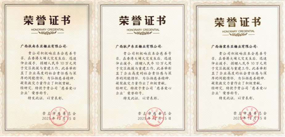獲悉香港大埔遭受?chē)乐鼗馂暮?,東亞糖業(yè)汪鴻洲首席執行官當即指示,要積極履行企業(yè)社會(huì )責任,踐行企業(yè)擔當,為受災民眾奉獻愛(ài)心、提供力所能及的急需幫助。在汪鴻洲首席執行官親自安排部署下,東亞糖業(yè)立即行動(dòng),通過(guò)旗下的廣西扶南東亞糖業(yè)有限公司、廣西馱盧東亞糖業(yè)有限公司、廣西海棠東亞糖業(yè)有限公司與崇左市慈善總會(huì )聯(lián)系捐贈事宜,在最短的時(shí)間內完成了3家公司各10萬(wàn)元(東亞糖業(yè)合計30萬(wàn)元)的善款轉賬,助力受災居民的過(guò)渡安置和基本生活保障。上述3家公司被崇左市慈善總會(huì )授予“慈善愛(ài)心企業(yè)”榮譽(yù)稱(chēng)號。